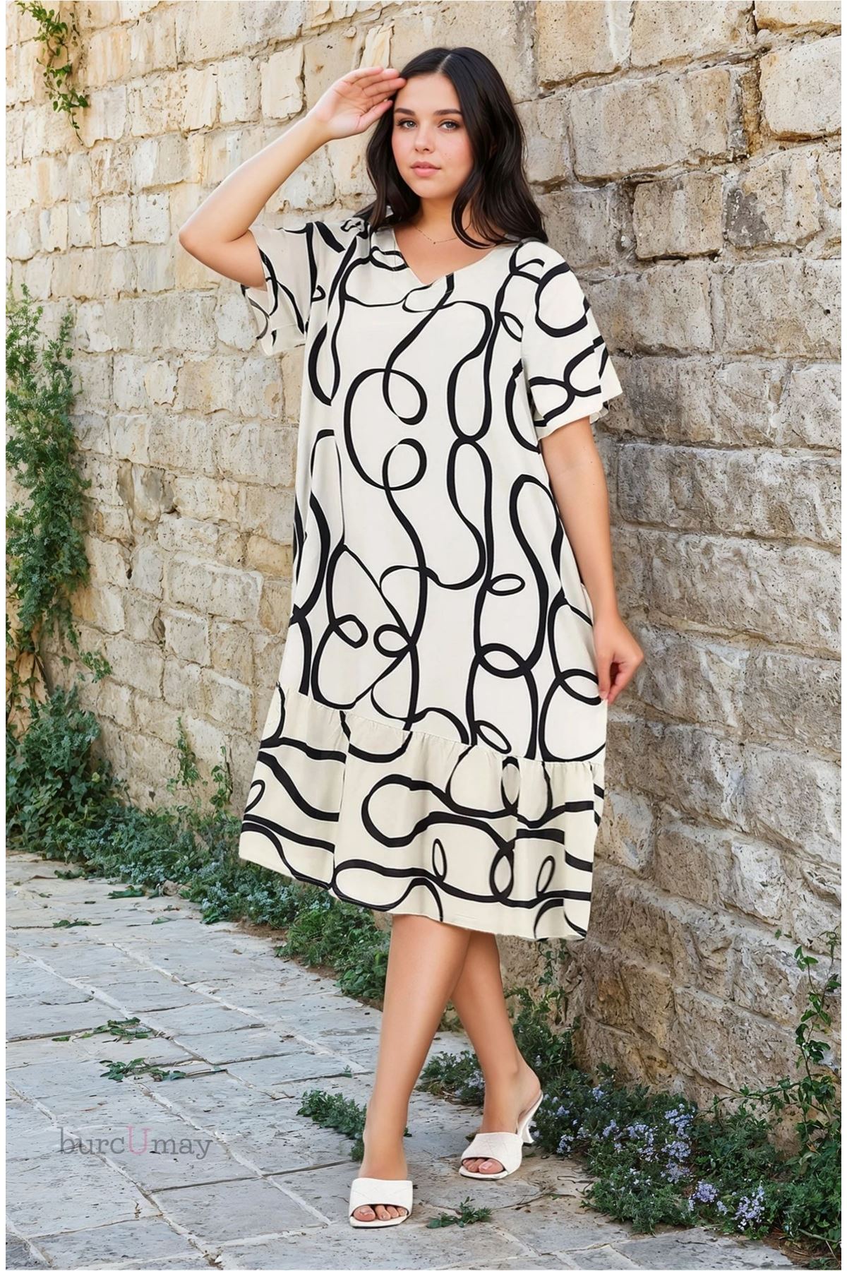 Yaz aylarının vazgeçilmezi olmaya aday bu kadın büyük beden kısa kollu viskon elbise, rahat kesimi ve göz alıcı modern deseniyle hem şık hem kullanışlı bir alternatif sunar. Ekru zemin üzerine siyah desenlerle hareket kazanan tasarımı, sade ama dikkat çekici bir görünüm sağlar. Günlük kullanım, şehir gezileri ya da tatil kombinleri için idealdir.
