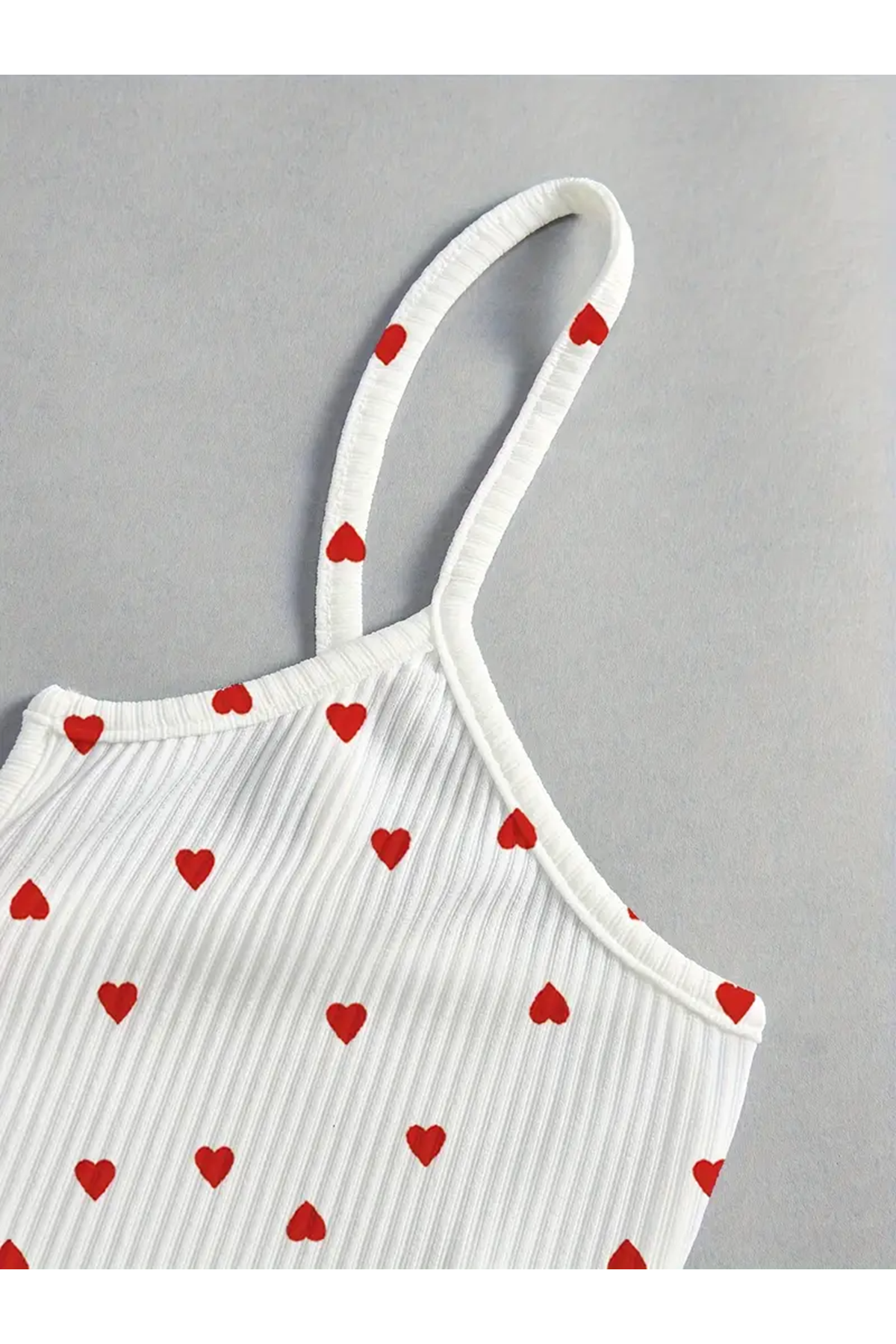 Combining comfort and style, this heart-patterned summer pajama set with a sleeveless top, mini crop design, and shorts offers a cozy sleep on warm summer nights. Its soft and lightweight fabric is breathable and skin-friendly. Adorned with chic heart prints and red bow details, this set gives a cute yet elegant look.