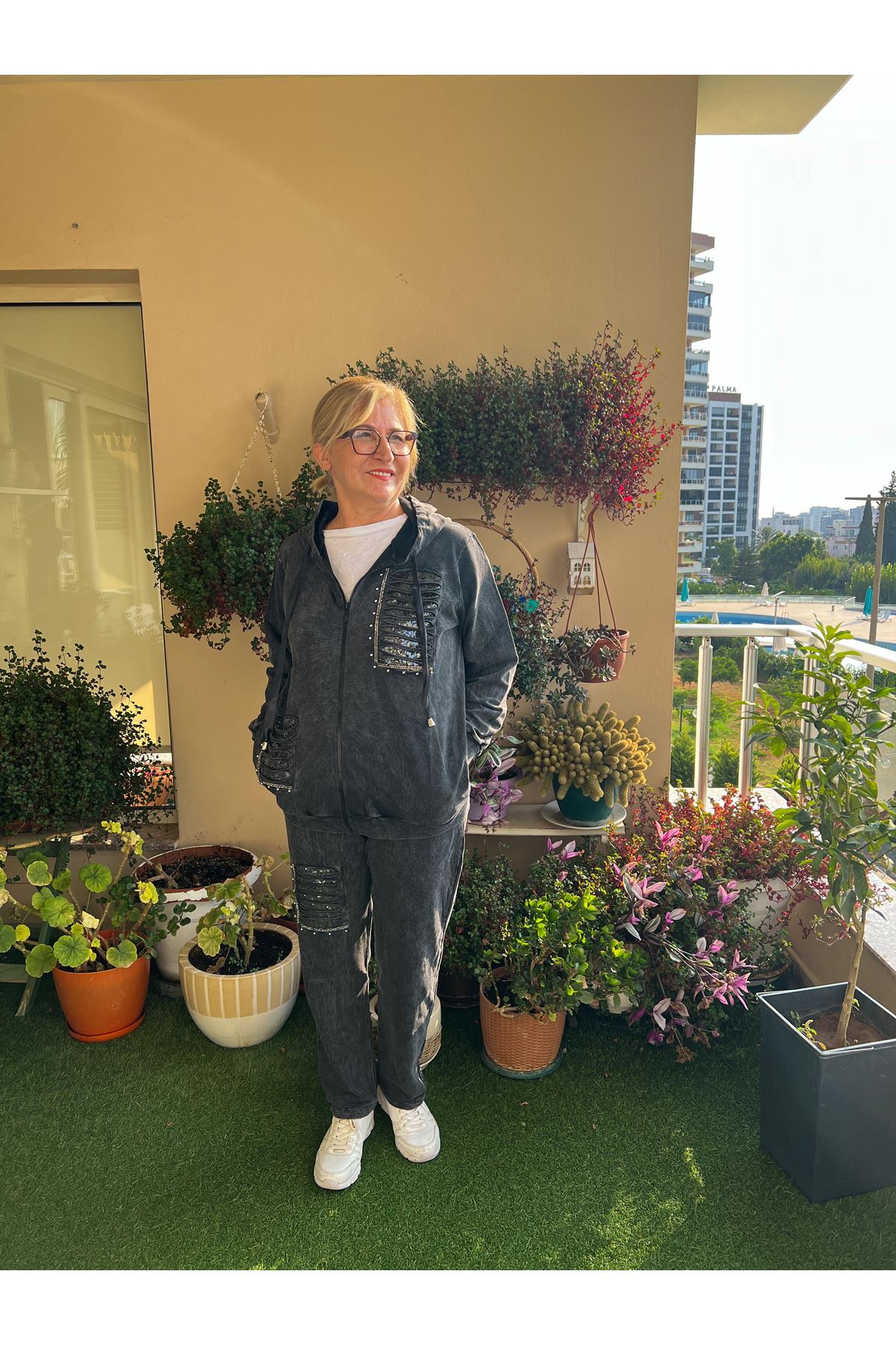 Kadın Fermuarlı Kapüşonlu Siyah Yıkamalı Taşlı Büyük Beden Eşofman Takımı